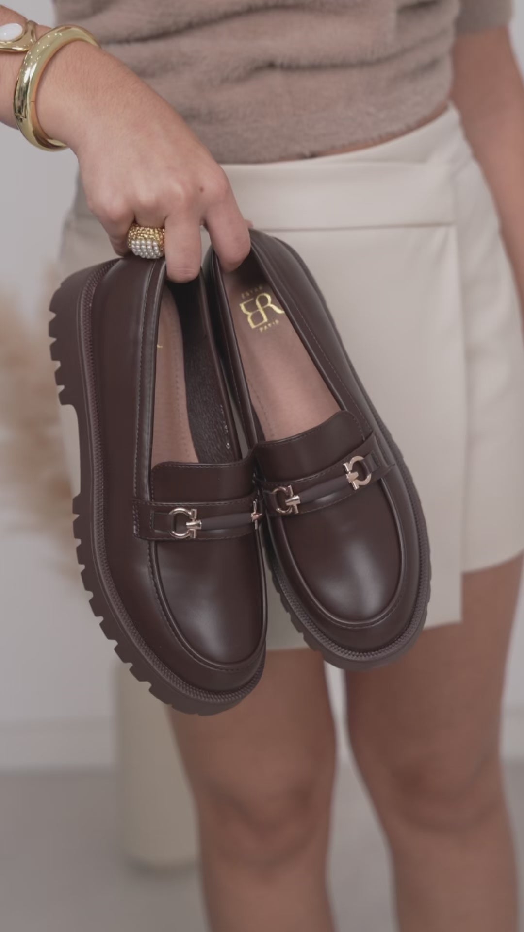 Mocassin femme marron élégant avec bijou doré et semelle crantée